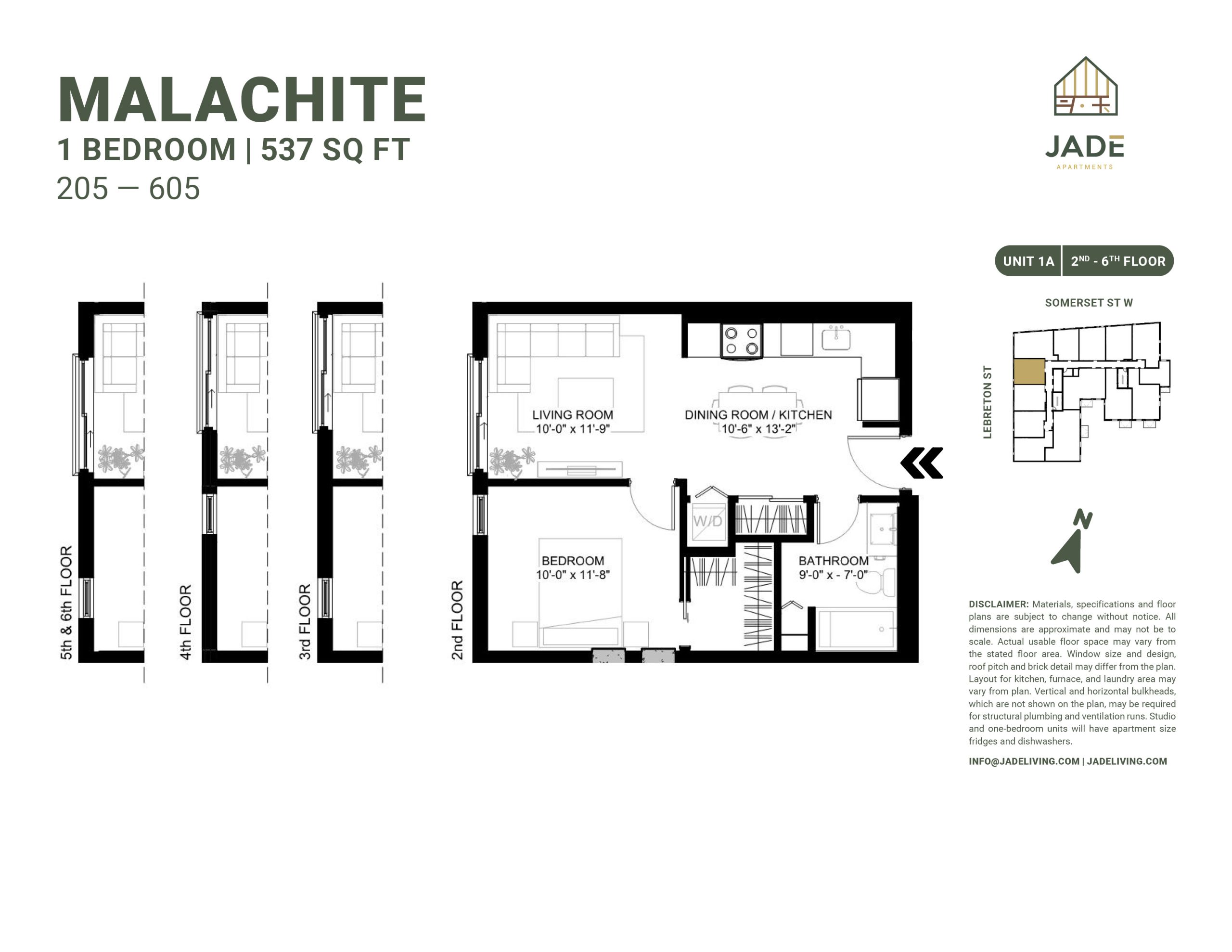 DISCLAIMER: Materials, specifications and floor plans are subject to change without notice. All dimensions are approximate and may not be to scale. Actual usable floor space may vary from the stated floor area. Window size and design, roof pitch and brick detail may differ from the plan. Layout for kitchen, furnace, and laundry area may vary from plan. Vertical and horizontal bulkheads, which are not shown on the plan, may be required for structural plumbing and ventilation runs. Studio and one-bedroom units will have apartment size fridges and dishwashers.
